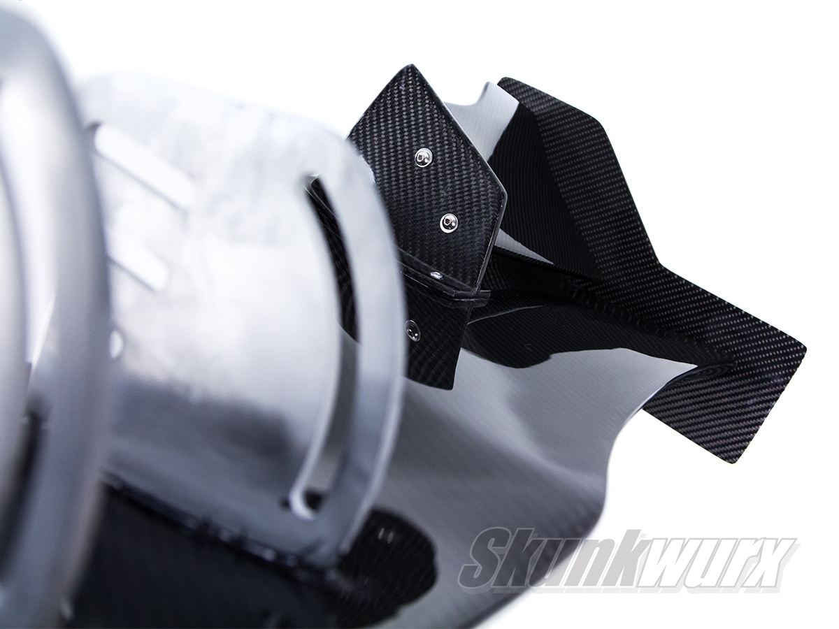 Skunkwurx 'Duo' Ariel Atom Front Wing available in carbon fibre. This high quality carbon fibre or fibreglass front wing without doubt gives the Atom a more of a professional race car look. The sweeping leading edges of the wing make the car appear to be more aerodynamically streamlined and the angle of attack can be adjusted by 35-40 degrees.