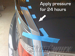 After the spoiler is installed, use masking tape to apply pressure to the spoiler overnight. The tape will take several hours to cure fully and it is important the edges of the spoiler are held down firmly. DO NOT tape from the center lip of your spoiler down to the vertical edge, this will peel the spoiler off and not give a flush fitting.