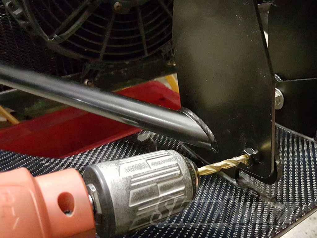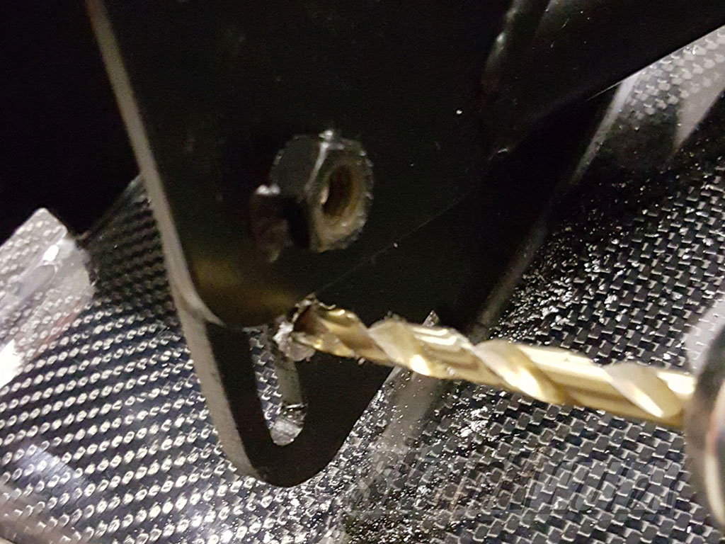 Using a 6mm HSS drill bit, feed through from the OUTSIDE of the bracket through the welded nut and operate the drill for a few seconds such that a small dent is drilled in to the bracket on the wing. Try to ensure the drill bit is centered through the nut and avoid letting the drill bit touch the walls of the nut as this will shave away the thread on the nut. Do not attempt to drill all the way through the bracket as more than likely you will damage the inside thread of the fixing nuts. Also ensure the wing does not start swiveling down due to the vibrations. If this happens then simply tighten the rear nuts further so the wing is locked in to position. Repeat the process on the other side.