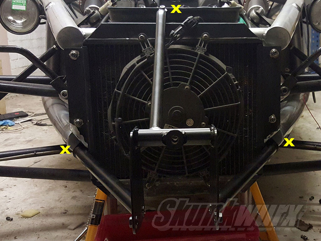 The main bracket can now be fitted on to the car, and is held in place by fixing to the two holes in the two butterfly brackets installed in Step 3 above, and the existing mounting hole on the chassis behind the radiator, half way across the top.