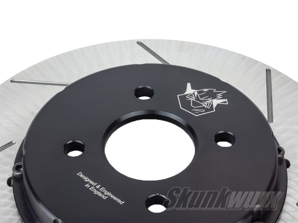 The bells on all Skunkwurx two-part discs are made with hard anodised aluminium which prevents it from rusting or fading from heat/light. The rotors are interchangeable. So a fully-floating disc may at a later date be converted in to a fixed two-part disc or vice versa.